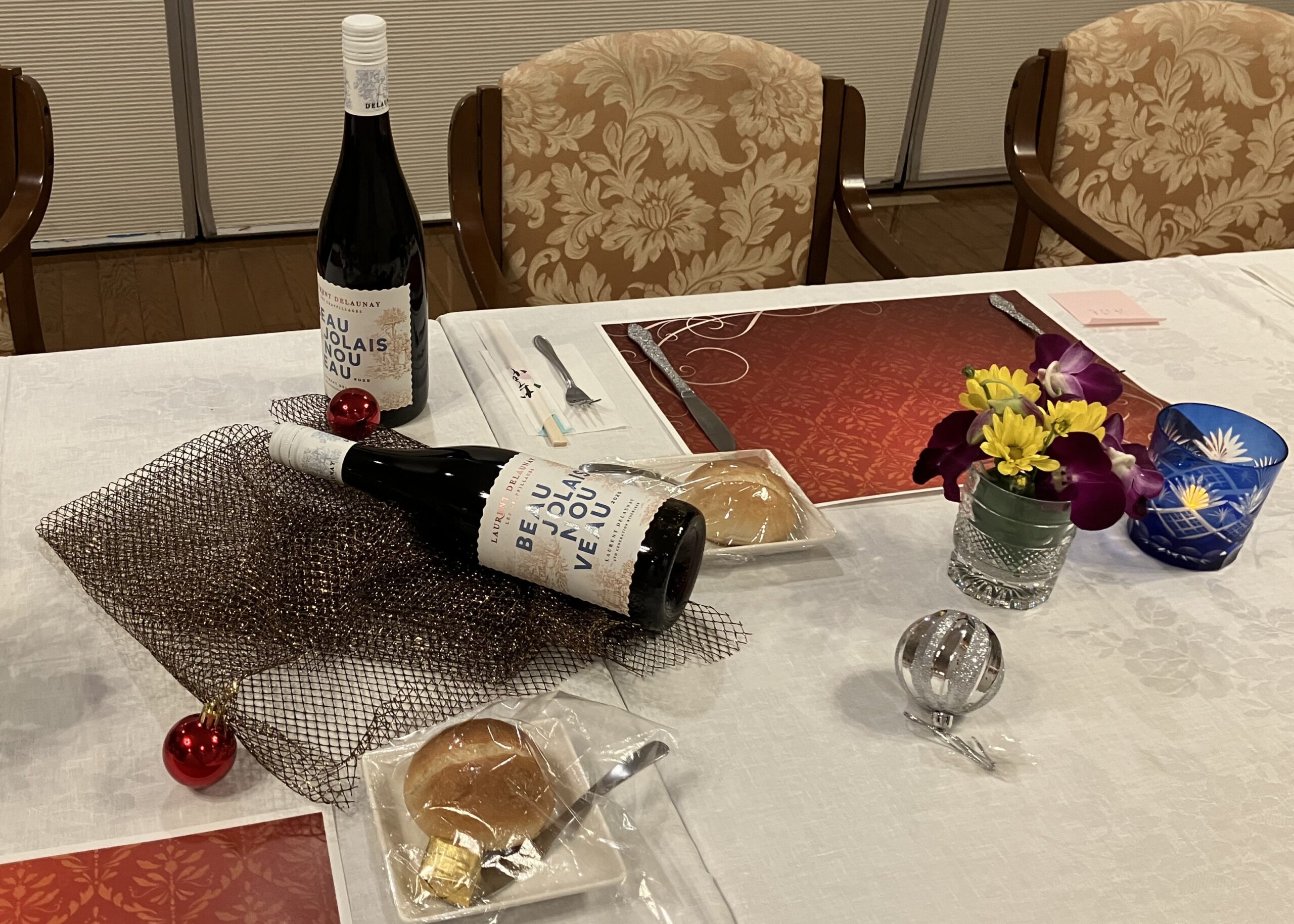 フィレンツェライフ青山では2025年11月20日(木)にボジョレーヌーヴォと食事を楽しむ会を開催しました。 参集されたみなさまにボジョレヌーヴォとはフランスのブルゴーニュ地方ボジョレー地区で、その年に収穫されたブドウを使って造られる「新酒」のこと、この度初めての開催です、とご紹介しています。 施設長より「みなさまの健康をお祈りし、乾杯!」とのごあいさつからお食事がスタートです。 グラスのなかの灯りとお花もテーブルに飾って、雰囲気を盛り立てます。オードブルは、サーモンのカルパッチョ風 テリーヌ、クリームチーズカナッペです。 ボトルを持って、注ぎにまわられてお話をされていたお二人。お近づきになるには、一緒に食事をとるのが一番ですね。 生ハムのサラダとオニオンスープにメインディッシュは牛肉のグリルです。柔らかくて「とてもおいしい」とみなさんにご好評でした。 「私とこちらは1歳違い、こちらの方とも1歳違い」とお互いのお年の紹介するなど、お食事を楽しみながらのお話も弾みました。「ワインとともに語らう機会をまたつくってください!」と来年の開催も期待されていました。