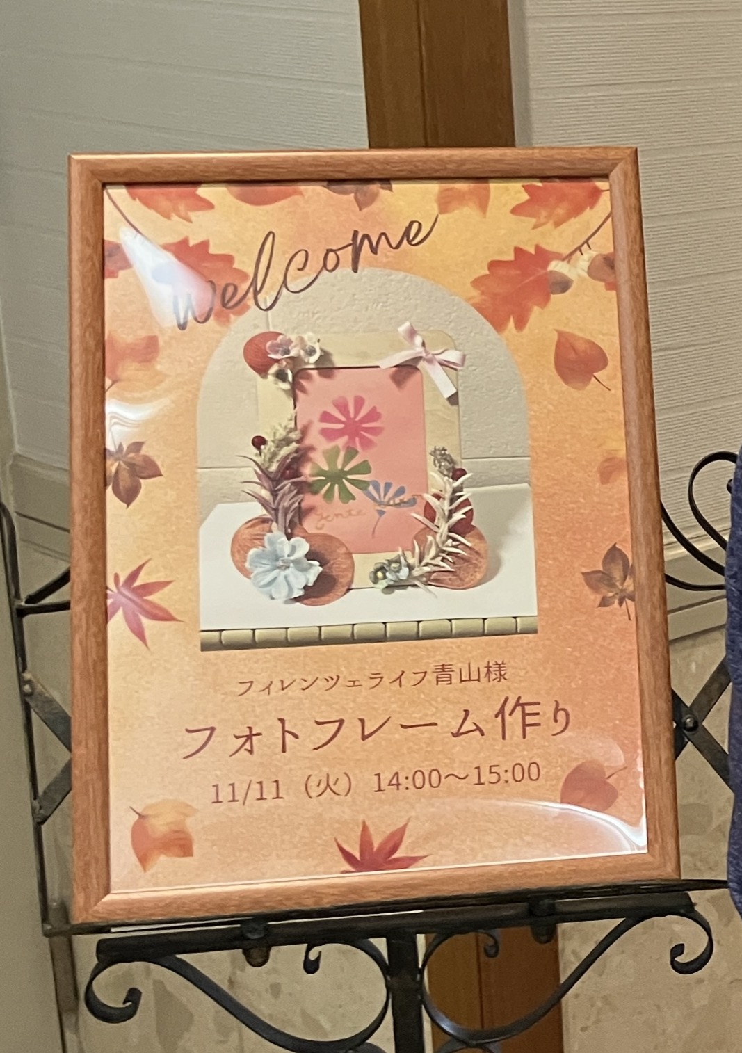 フィレンツェライフ青山では2025年11月11日にレクリエーションでフォトフレームを作りました。 シンプルなフレームに葉や木の実など、造花を配置していきます。「どこに置いていこうかな」「間が空いてるからここに葉っぱを置こうかな」など、悩みながらの作業です。 きれいに配置ができました。ひと仕事終えて少し、休憩です。 次に中央の写真を入れるスペースにステンシルをしていきます。 スポンジでお花の型にポンポンと色を移していきます。「きれいな色がいいわ」とピンクと黄色を選ばれたご入居者です。 すてきな作品ができあがりました。「かわいいわぁ」とご自身の作品をご覧になって喜ばれています。 みなさんの作品がそろい、改めて見回してみますと、それぞれの個性が光って素敵です。お気に入りの写真をお部屋に飾って毎日をほがらかに過ごしていただきたいものです。