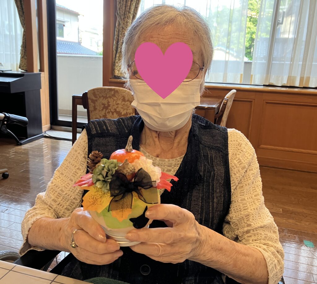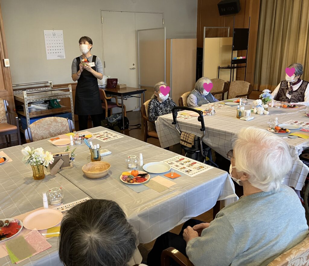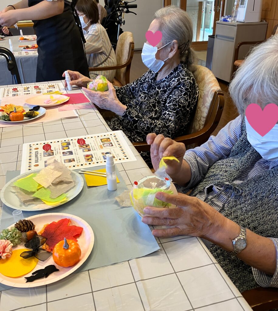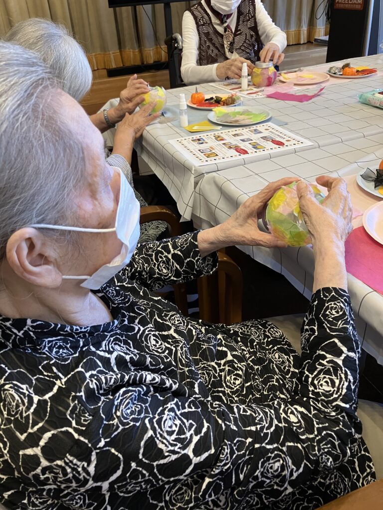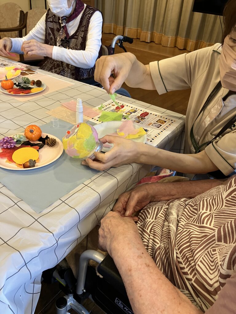 10月31日のハロウィンを前に、お部屋を彩るランタンを作ります。お皿には材料となる秋の季節にふさわしい素材(小さなカボチャ、どんぐり、枯れ葉など)が載っています。ご入居者はなぜか口々に「おいしそうねぇ」とお話されながら手に取られていました。