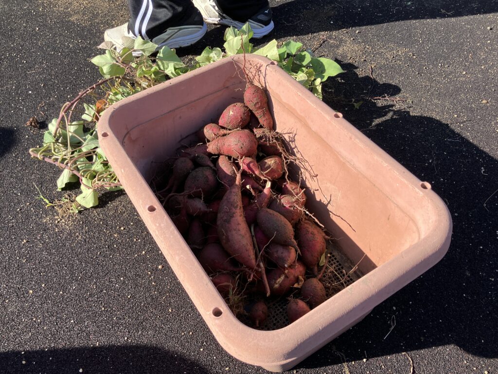 この箱2つ分のサツマイモが収穫できました!レストランで調理し、秋の実りをおいしくいただきましょう。