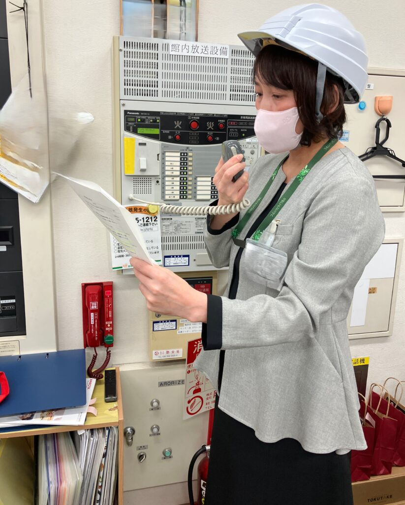 「訓練放送、火事です。火事です」と館内に訓練を周知します。このような放送は設備の確認もかねています。