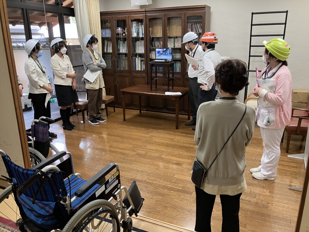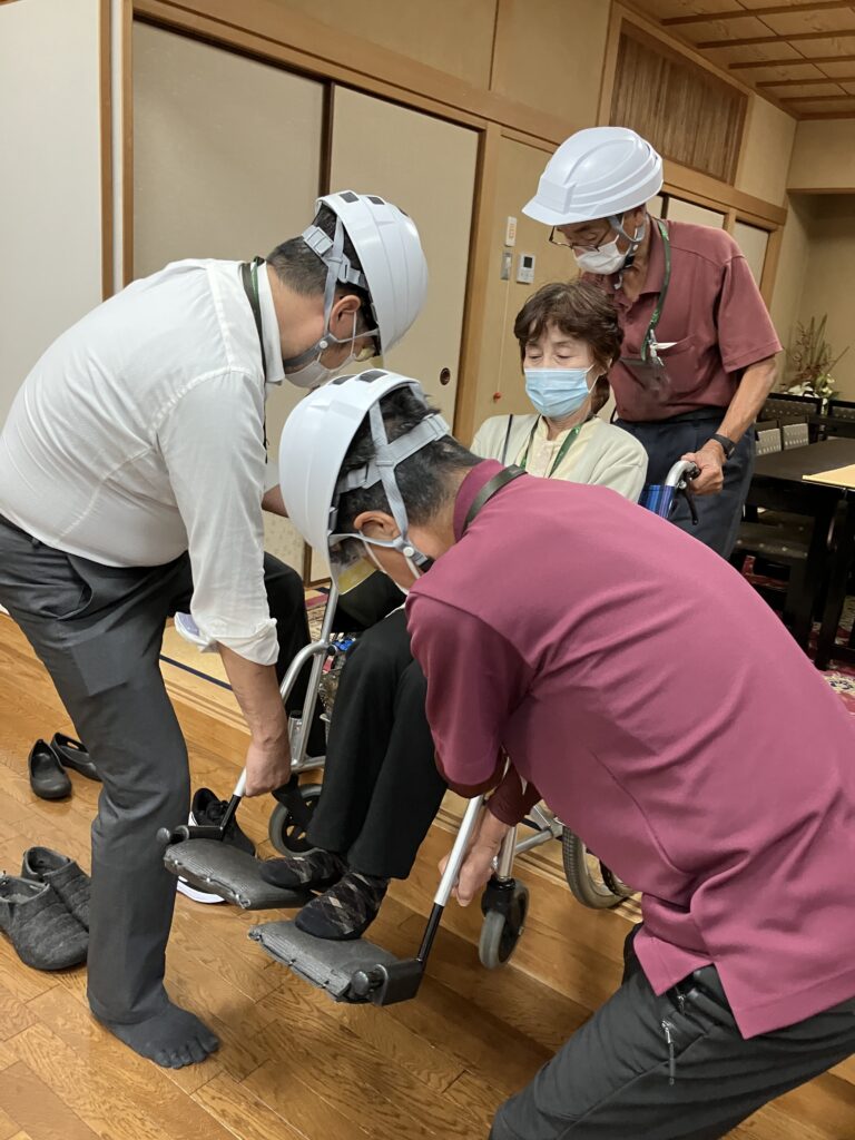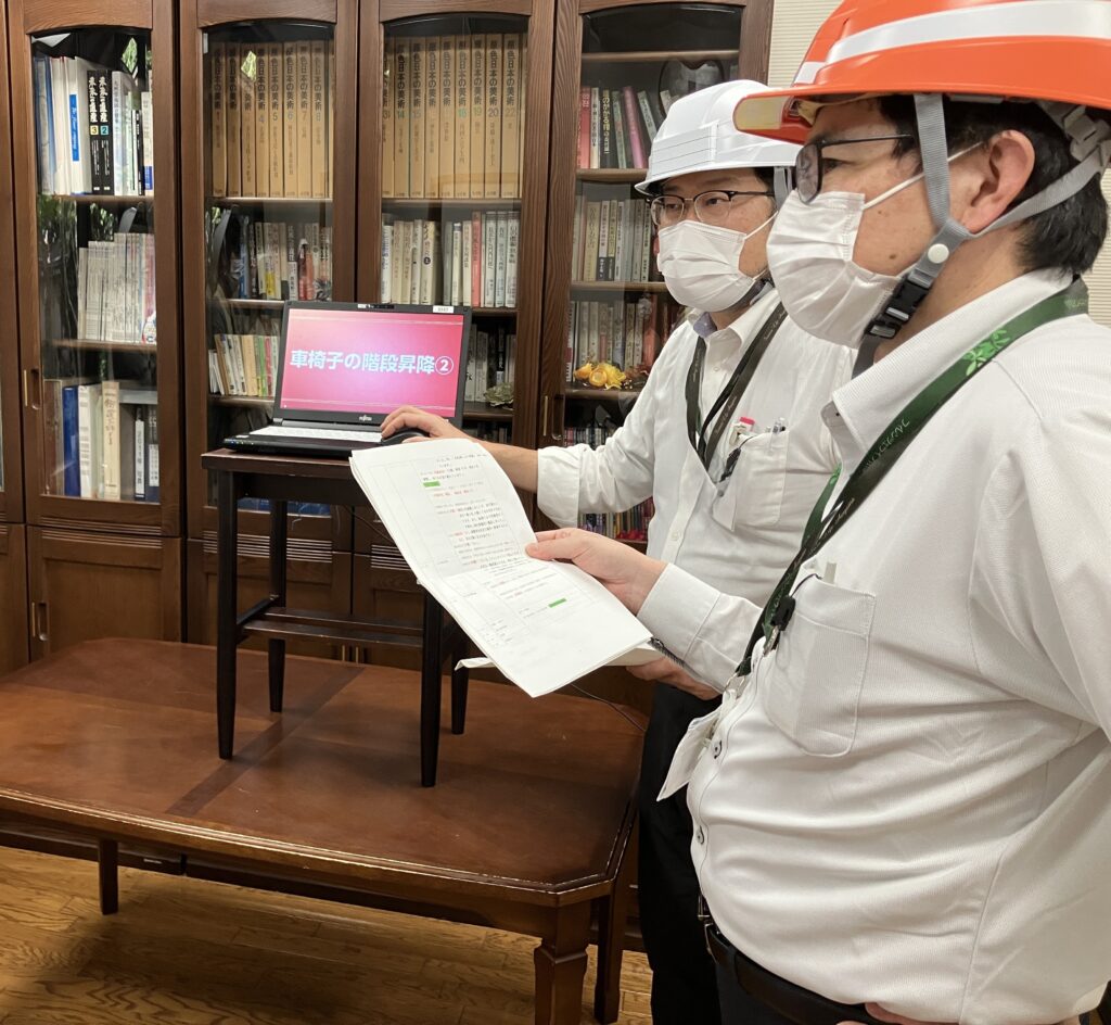BCP避難訓練では、車椅子の階段昇降を確認しました。