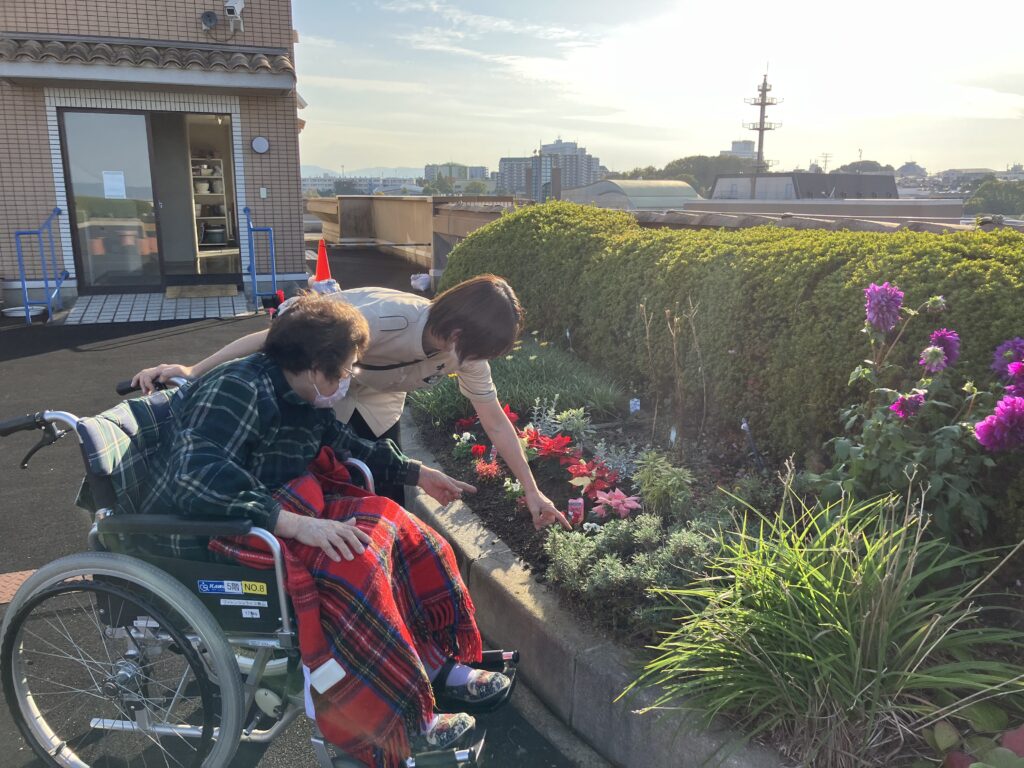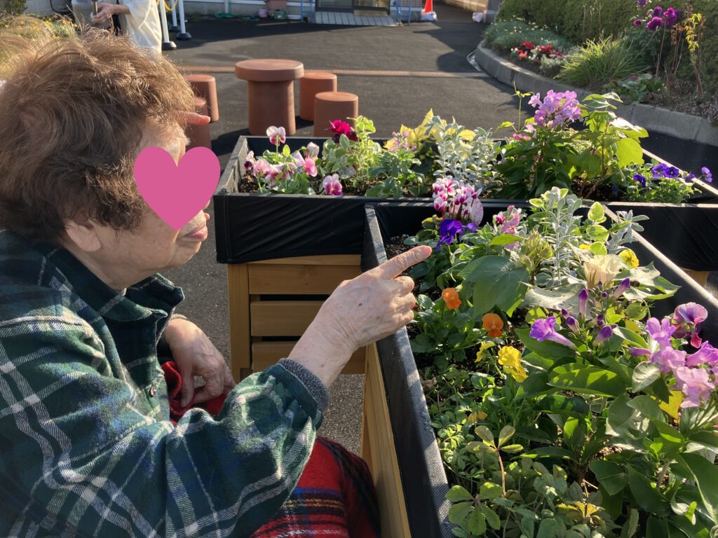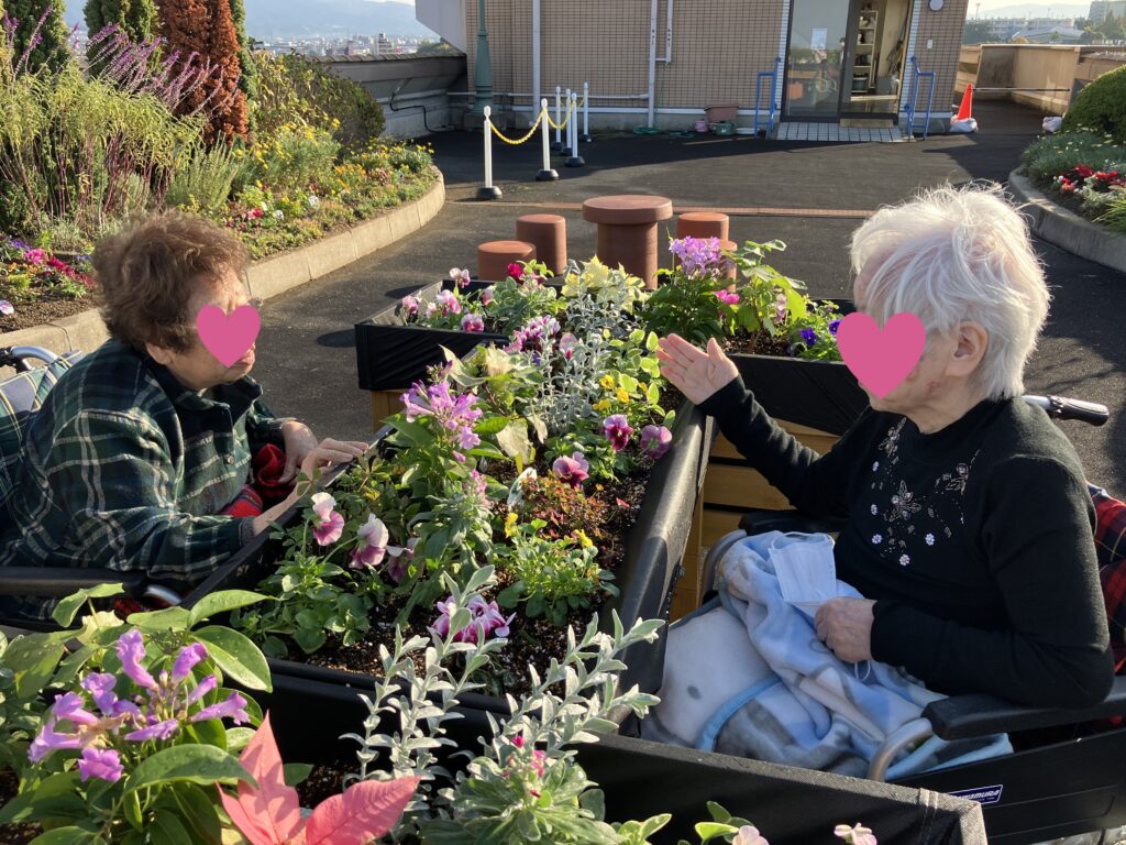 別の日には、屋上のお散歩です。先日植えたお花をごらんになっています。