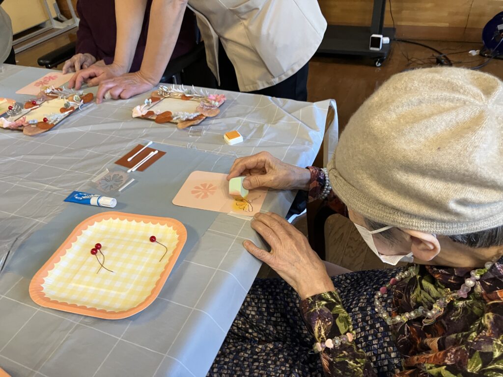 スポンジでお花の型にポンポンと色を移していきます。「きれいな色がいいわ」とピンクと黄色を選ばれたご入居者です。