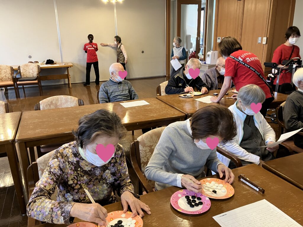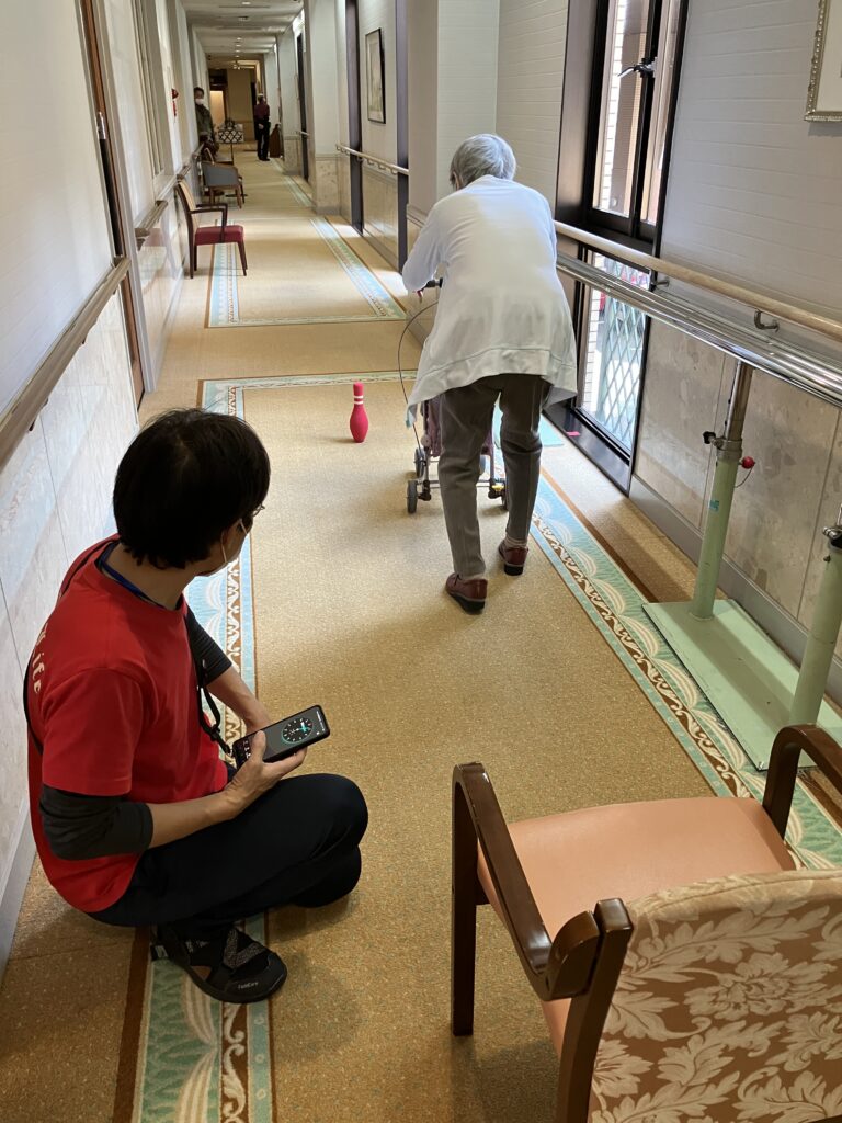 手前では箸でつるつるすべる碁石を隣の皿に移す「碁石運び」、奥では、立位で上肢をできる限り前方へリーチさせ、その到達距離を測定することで,転倒リスクや動的バランス能力を評価する「ファンクショナルリーチテスト」を行っています。