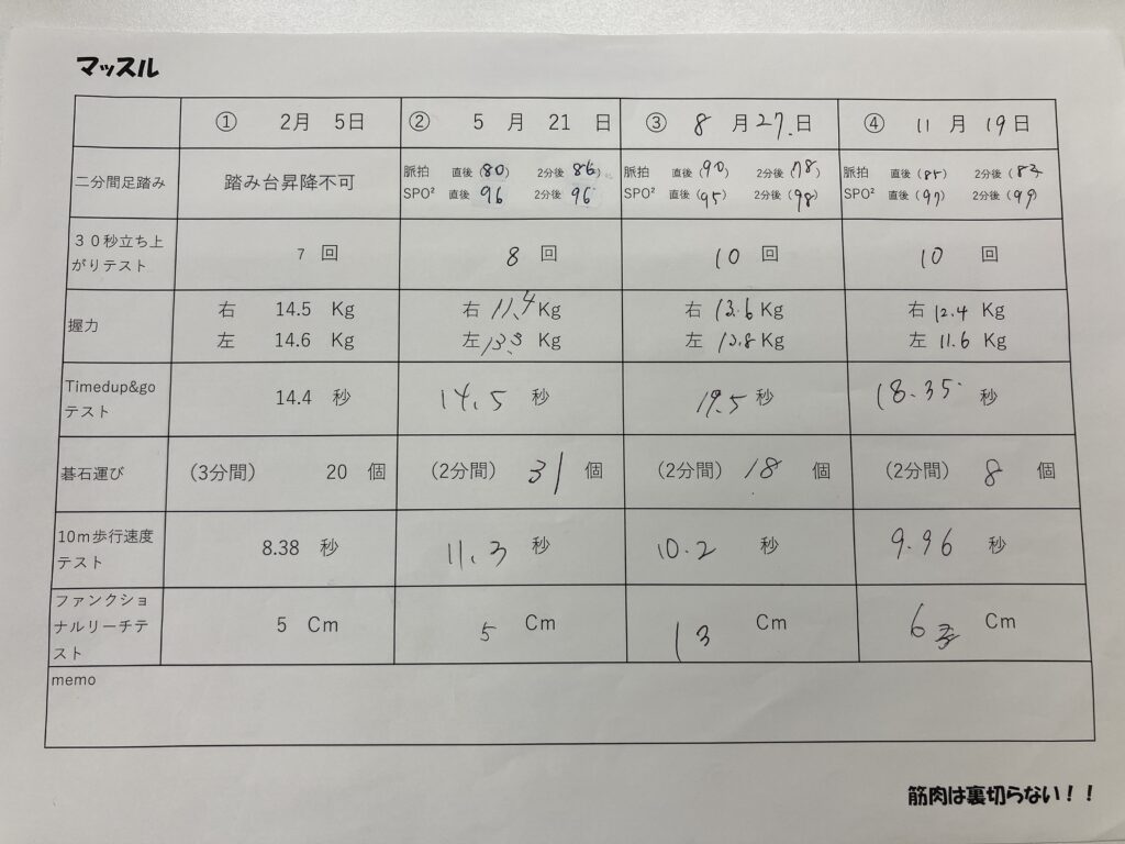 2月からの測定の経過です。「筋肉は裏切らない!」参加者はテストの結果を楽しみに日々のトレーニングに励んでいらっしゃいます。