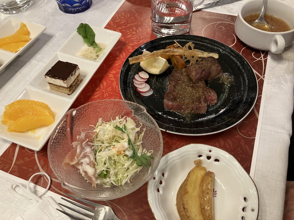 生ハムのサラダとオニオンスープにメインディッシュは牛肉のグリルです。柔らかくて「とてもおいしい」とみなさんにご好評でした。
