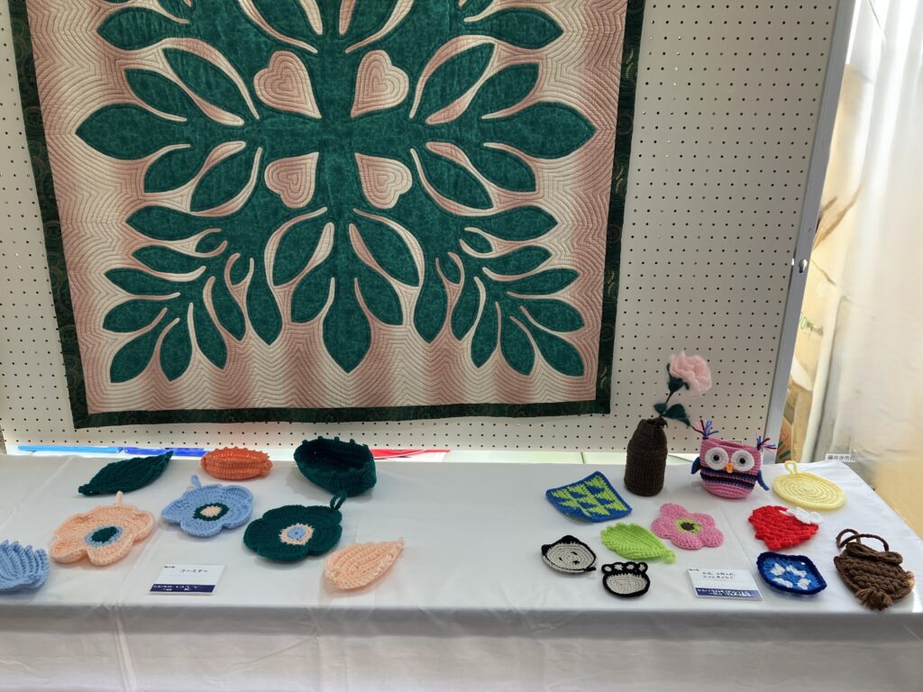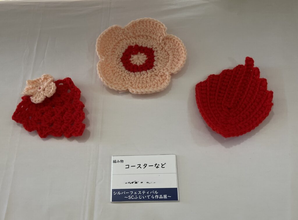 この催しは世代間交流を通じて高齢者の健康・生きがいづくり、社会参加をすすめ、明るい長寿社会を目指すことを目的に開催されました。ご入居者が作成した手編みのコースターや小物です。