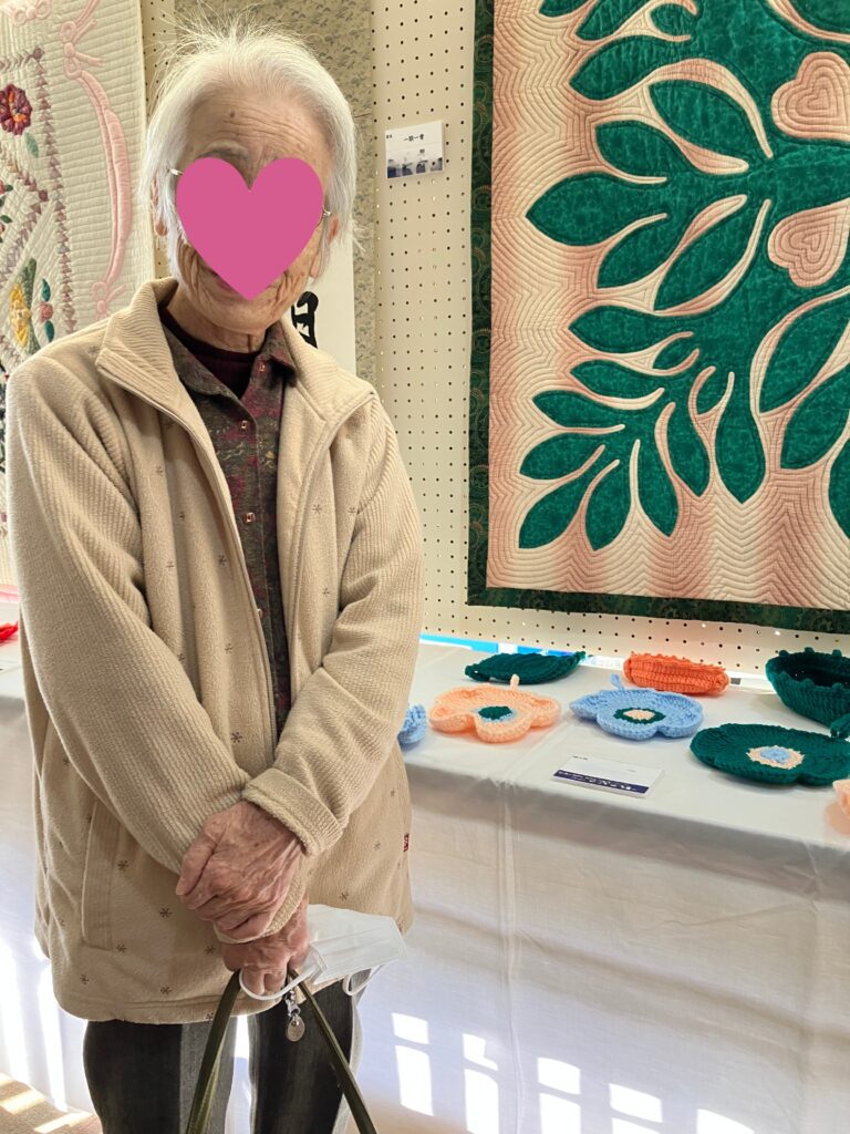 作品と一緒にハイチーズ。ご入居者は他の出品者の方々とも作品にまつわるお話をされ、楽しくすごしていらっしゃいました。
