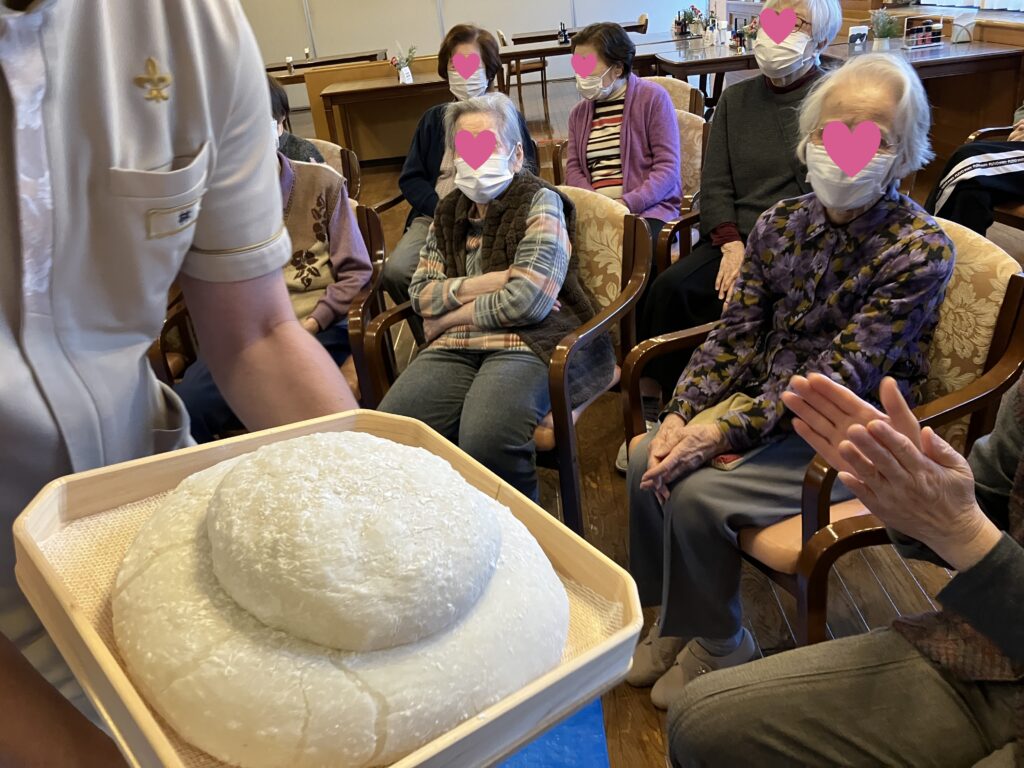 鏡餅の完成です!ご入居者と職員が協力してついたお餅です。ちょっとひろがりぎみ?でも、これもご愛嬌です。