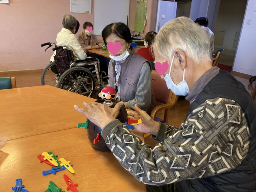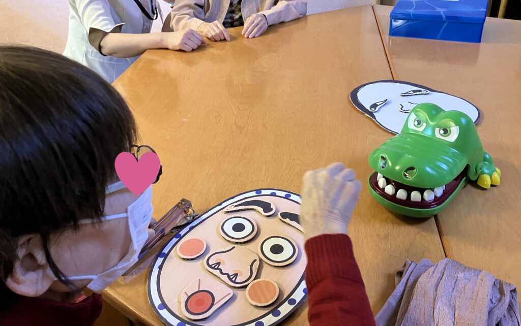 ワニの歯を順番に指で押してワニに噛まれたら負けのゲーム「ワニワニパニック」も円状に座ったご入居者がチャレンジします。噛まれないかヒヤヒヤされていたとか。