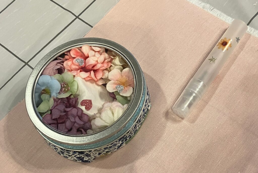 缶の飾りつけが終わると香りのスプレー作りです。ローズ、ベルガモット、ラベンダーの中からひとつを選びます。先生よりそれぞれの香りの特徴と効能などが説明されました。ローズは安心感、自律神経を整えるとのこと。ローズを選ばれる方が多かったようです。