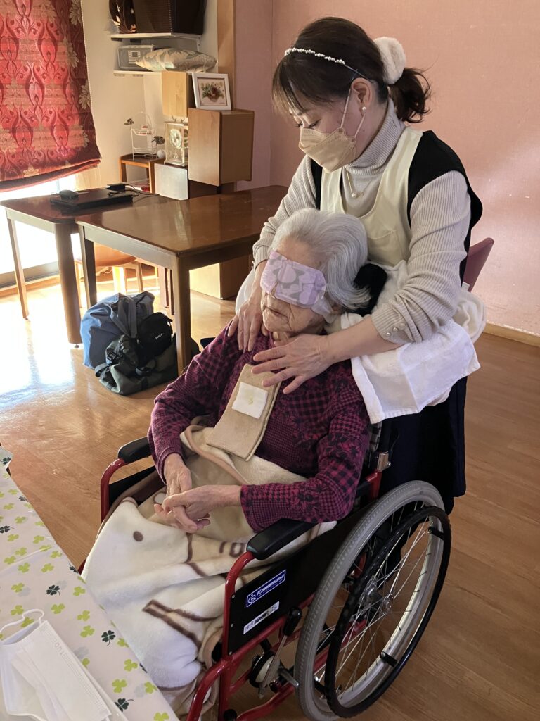 施術されながら「思い出話が広がってとても楽しくてしあわせでした」「頭があたたかくなって気持ちよかったわ」という声をたくさんいただきました。「この気持ちいいという感覚は”幸せホルモン”がたくさん出ていることなんですよ」と施術者。みなさんの体にたくさんの幸せホルモンがあふれた時間のようでした。