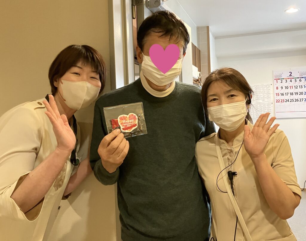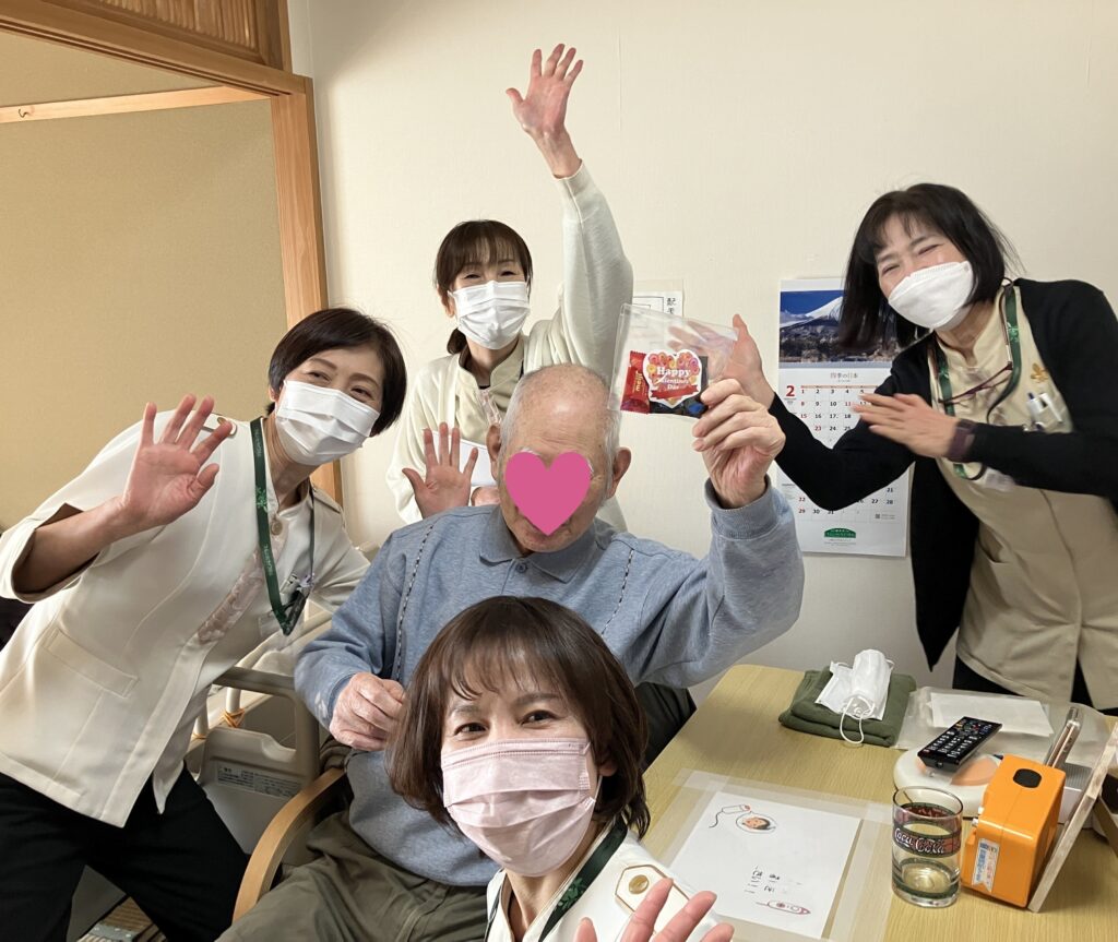 女性職員がたくさん訪問するので、お部屋は華やぎ、にぎやかです。ご入居者もはじけて受け取ってくださいました。バレンタインデー、職員のご入居者への愛が飛び交う日となりました。